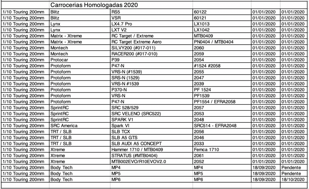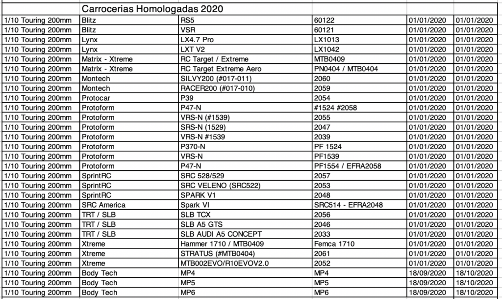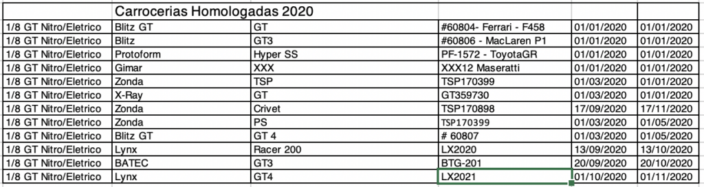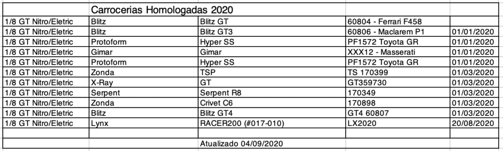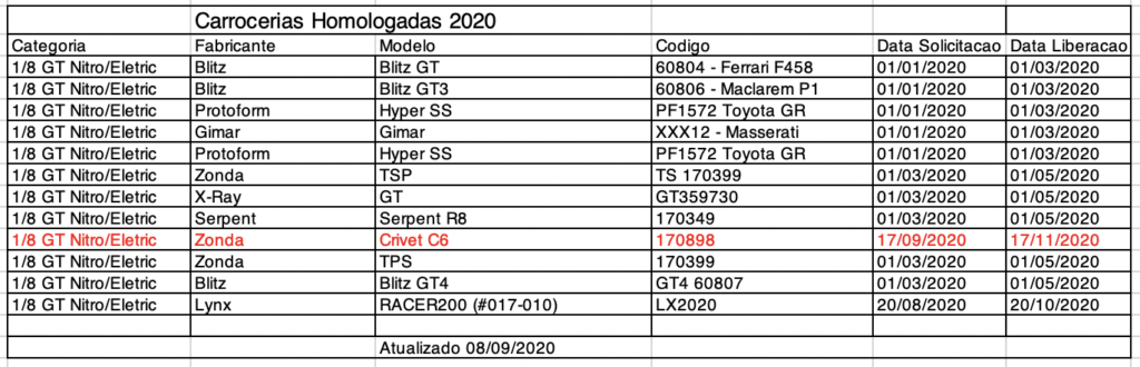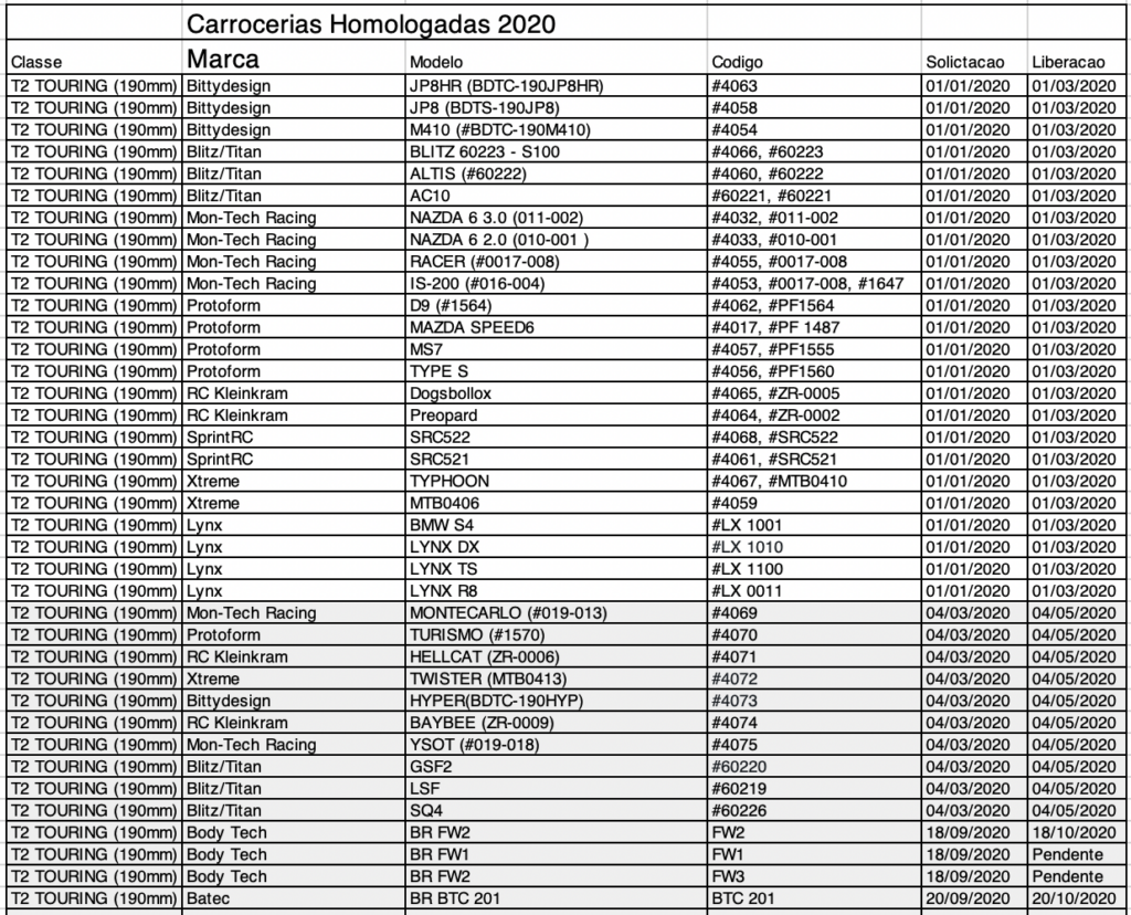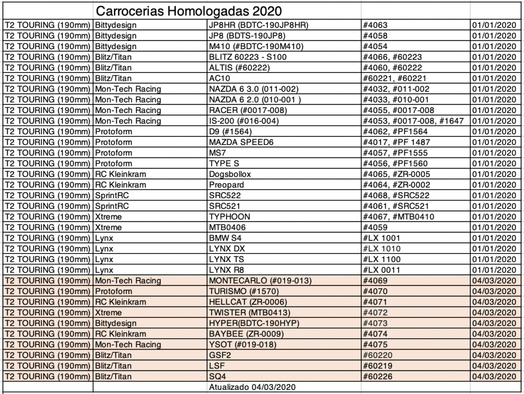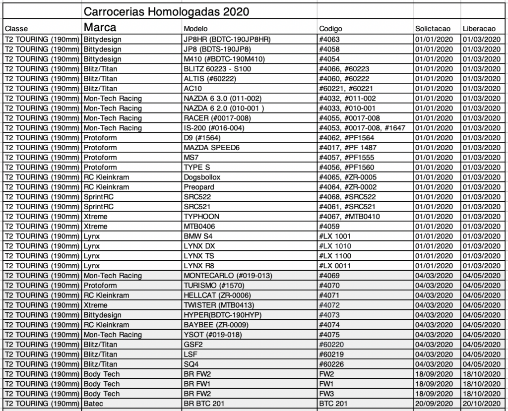 A partir de 2020, nas categorias On Road, todos as carrocerias deverão passar por um processo de homologação para poderem ser utilizadas no Campeonato Brasileiro e Campeonato Paulista partir da data homologação. Carroceria importadas poderá ser utilizada nos Campeonatos apos 60 dias e as de fabricacao nacional 30 dias.